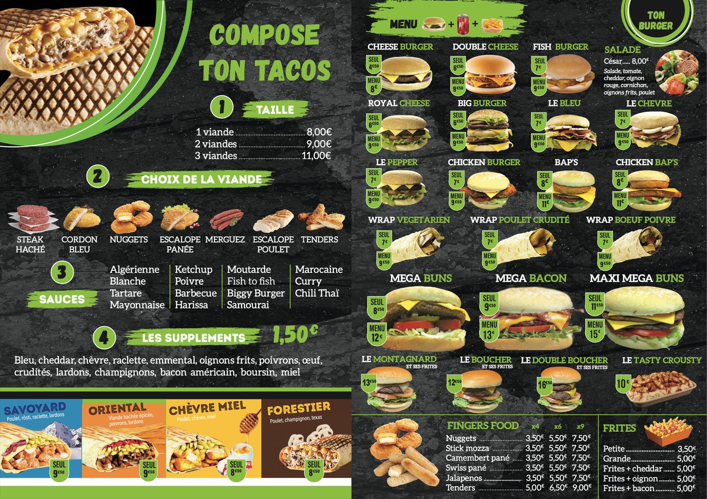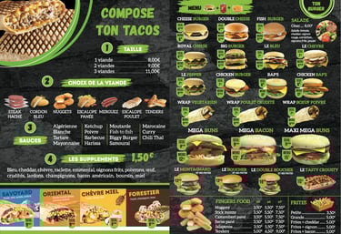 Venez personnaliser votre tacos, succomber à nos délicieux burgers, grignoter nos fingers food ou craquer pour nos smoothies, milk-shake et désserts.